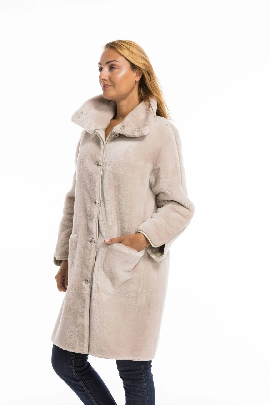 Manteau en peau retournée pour femme ,classique. On aime sa ligne assez sobre, coupe droite , confort. Vous pouvez la porter de deux façons car elle est réversible.Vous pouvez la porter du coté du lainage ou du coté aspect huilé or. Son col est assez large très enveloppant, il se ferme à l’aide de boutons. Vous avez deux grandes poches plaquées , sur le coté huilé , il y a une bande cuir beige sur les boutonnières, sur le dessus de la manche. Comptez une longueur corps de 94 cm sur la taille 40.