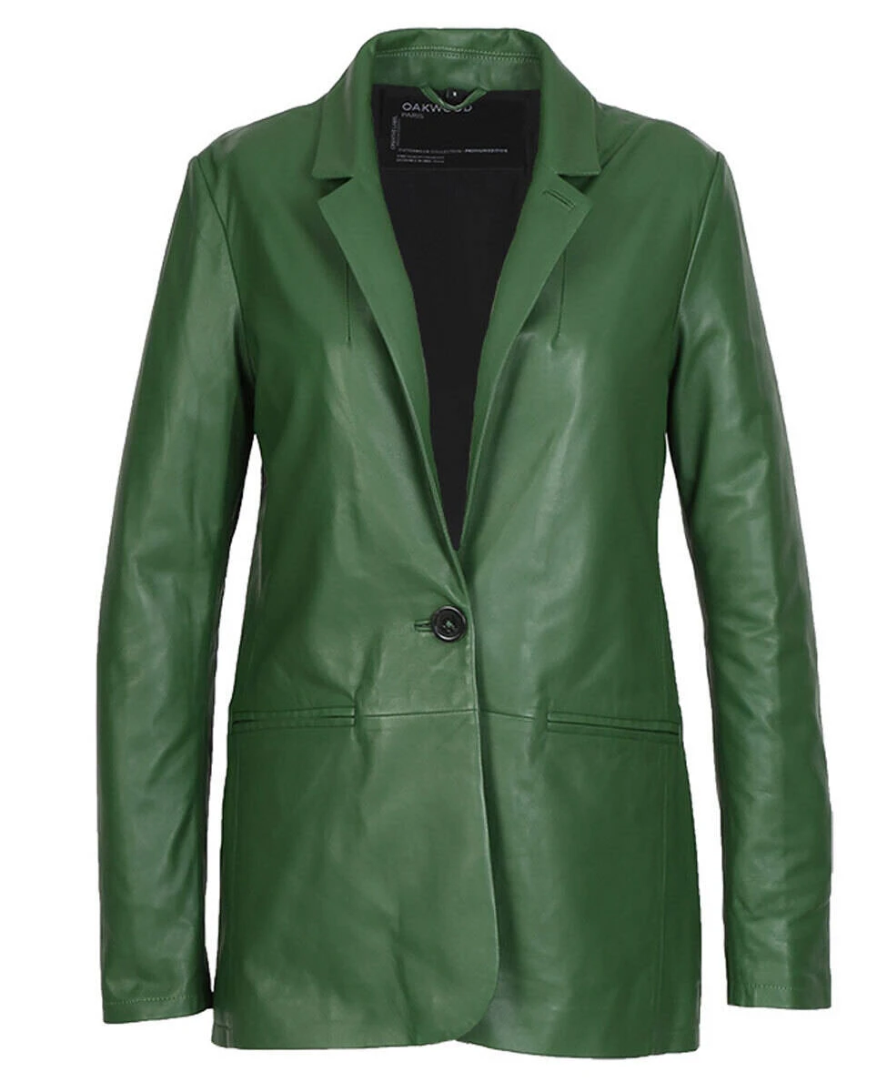 Très jolie veste en cuir pour femme de la marque Oakwood dans un coloris très tendance vert émeraude . Le blazer est la pièce du moment, celle que l’on marie avec toutes ses tenues, à la fois casual comme chic. Quoi de mieux alors pour se démarquer qu’un blazer en cuir véritable ? Ce modèle est en cuir de mouton lisse et doux , très agréable et confortable à porter . Il possède un col tailleur à revers, une coupe droite, des poches passepoilées et une fente d’aisance aux poignets. Petit détail, vous avez une boutonnière au niveau du col ! Il est également doté de deux poches intérieures zippées et d’une doublure douce pour un enfilage facile.