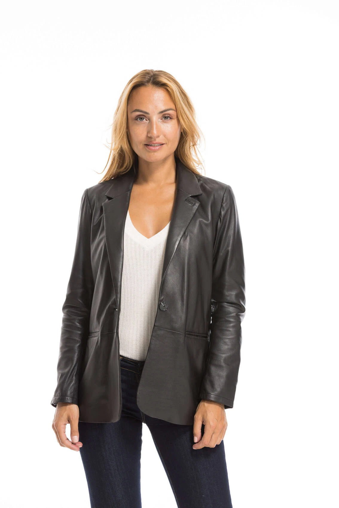 Très jolie veste en cuir pour femme de la marque Oakwood . Le blazer est la pièce du moment, celle que l’on marie avec toutes ses tenues, à la fois casual comme chic. Quoi de mieux alors pour se démarquer qu’un blazer en cuir véritable ? Ce modèle est en cuir de mouton lisse et doux , très agréable et confortable à porter . Il possède un col tailleur à revers, une coupe droite, des poches passepoilées et une fente d’aisance aux poignets. Petit détail, vous avez une boutonnière au niveau du col ! Il est également doté de deux poches intérieures zippées et d’une doublure douce pour un enfilage facile.