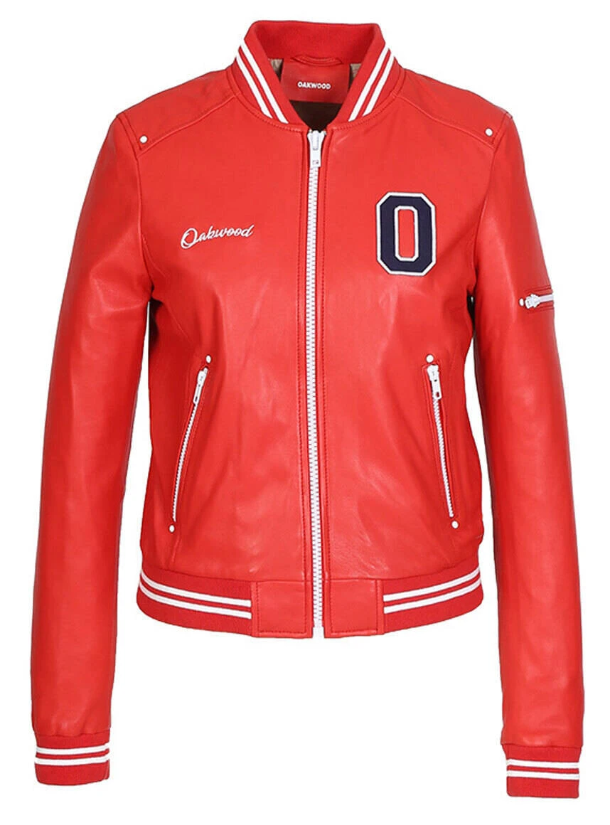 Blouson style teddy collège pour femme en cuir d’agneau. Il est très souple, vraiment confortable, c’est l’accessoire indispensable . Vous avez un petit col mao en tricot à bandes et bien entendu on retrouve également le bord cote au niveau de la taille et des bas de manches . Il se ferme à l’aide d’un zip droit, ses deux poches biais sont elles aussi zippées, les fermetures sont de couleurs blanches. La marque est griffé sur la poitrine et un écusson avec la lettre O.