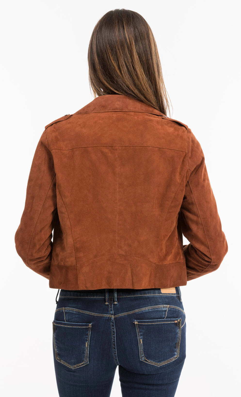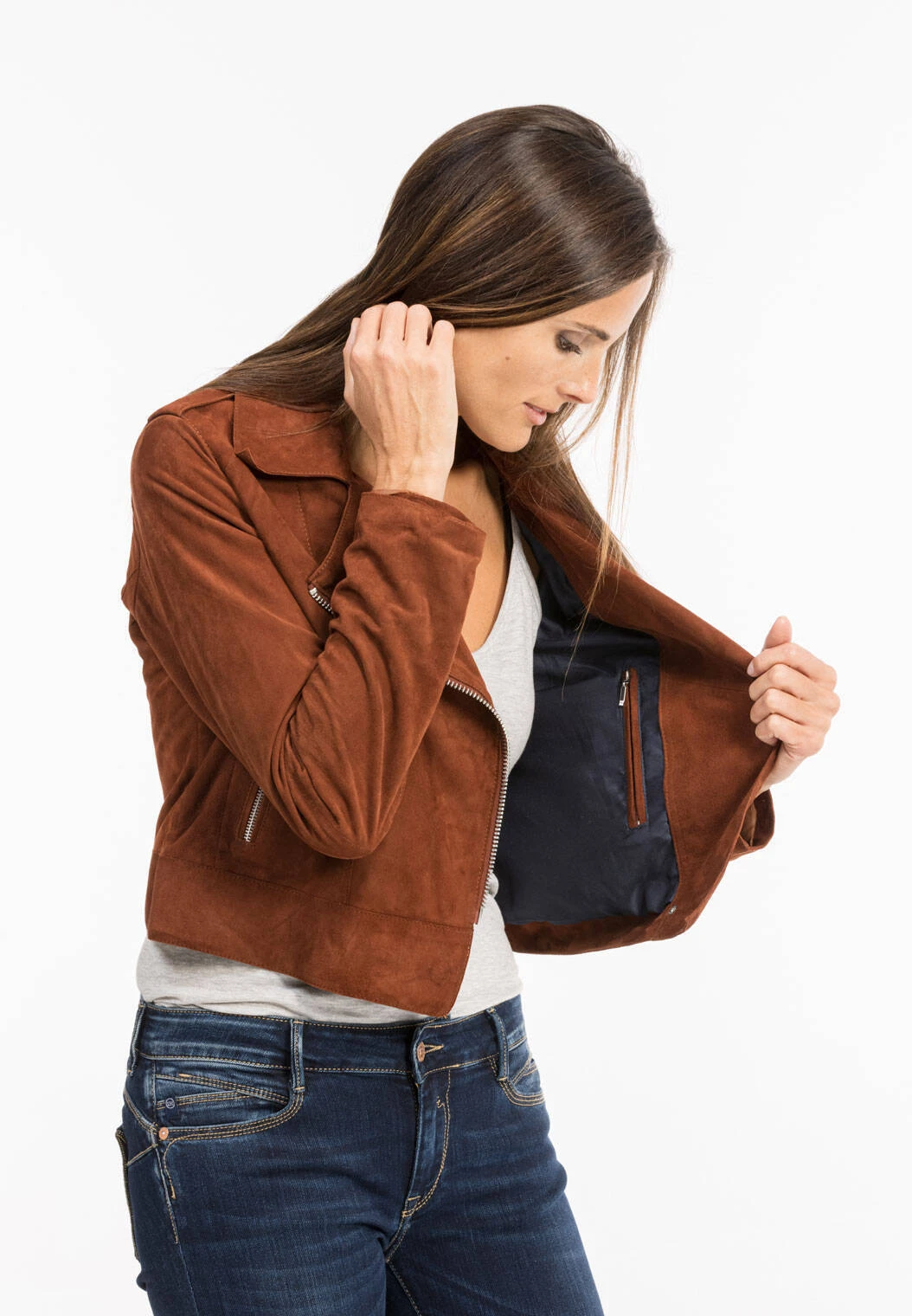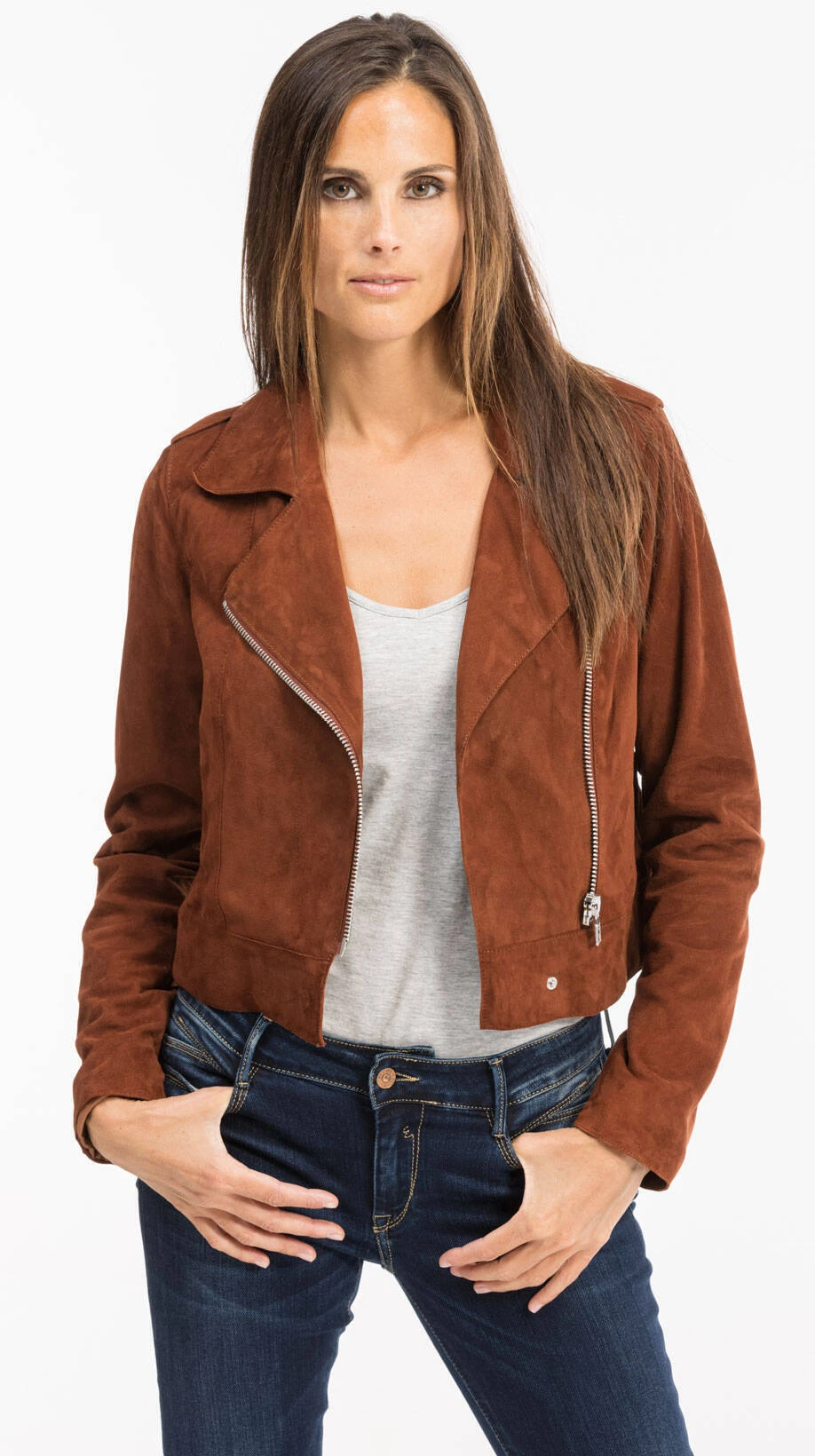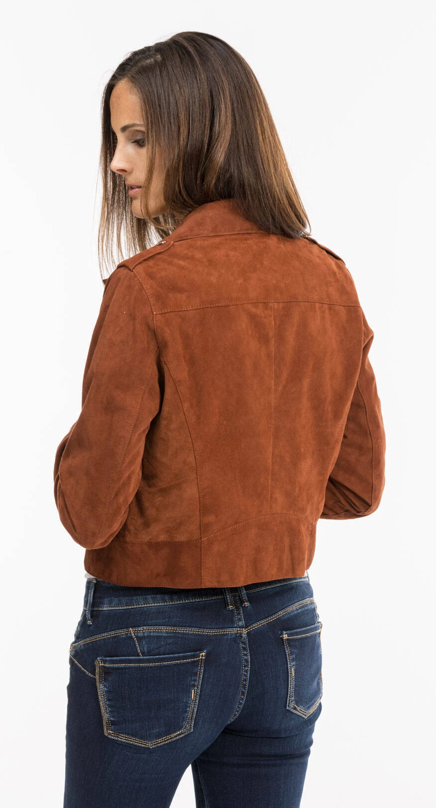 Petit blouson en cuir de chèvre velours, dans un style biker, sympa pour le printemps . Le cuir est vraiment très léger, souple, on ne le sent pratiquement sur soi .Sympa à porter sur un top , une robe, en remplacement d’un petit blazer ou gilet . Vous avez un col tailleur, des petites pattes d’épaules, un zip asymétrique, deux poches biais zippées.