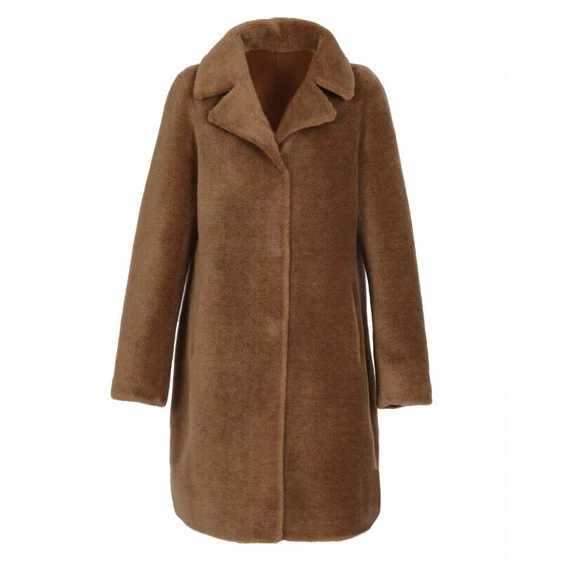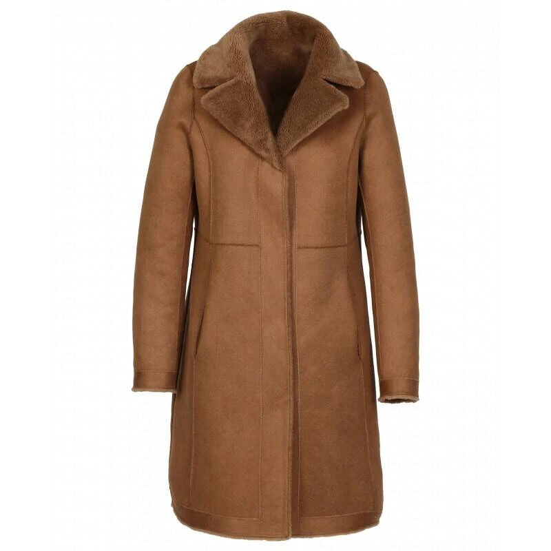Manteau réversible 100 % laine pour femme de la marque Oakwood . On reste sur une coupe assez classique avec sa coupe droite et son petit col à revers. On aime sa matière effet mouton retourné 100% laine d’un côté et imitation peau de l’autre qui en fait un modèle original et tendance ! Ce manteau long se ferme facilement avec des pressions métallisées invisibles et vous gardera au chaud tout l’hiver. Ses poches en biais vous permettront également de protéger vos mains du froid en toutes circonstances. Il est réversible, il vous offre donc deux looks différents pour se marier encore plus facilement avec votre garde-robe.