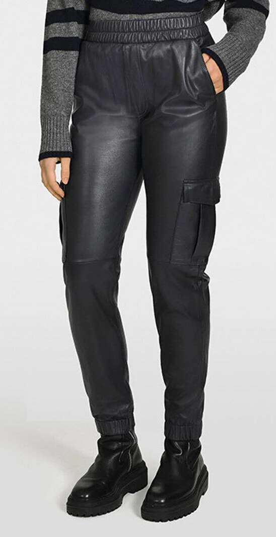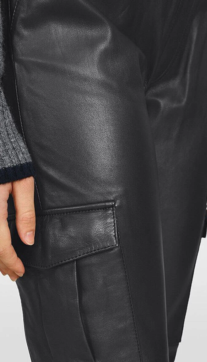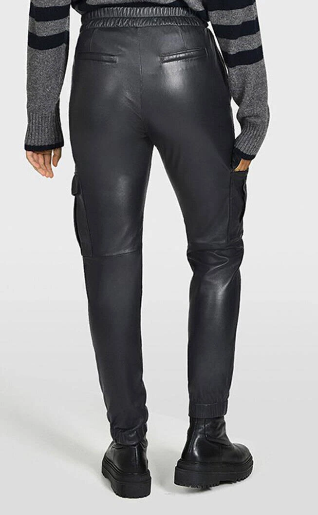 Pantalon pour femme en cuir d’agneau dans un coloris noir . Sa coupe est slim, surtout au niveau des jambes. La coupe reste assez confort avec sa taille élastique, le bas de jambe est lui aussi élastiqué . Vous avez bien entendu des poches cargo sur les cotés , sur l’arrière , vous avez deux poches droites au niveau du fessier.