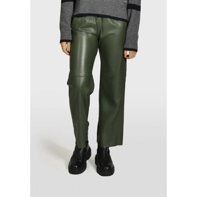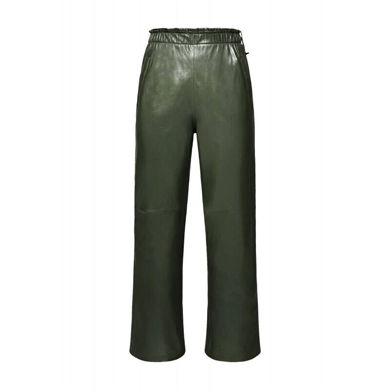 Pantalon en cuir pour femme de la marque Oakwood , on retrouve une forme large dans une coupe confort . Sa taille est haute et élastique , vous avez des poches biais sur l’avant très discrètes . Le bas du pantalon est coupé franc .