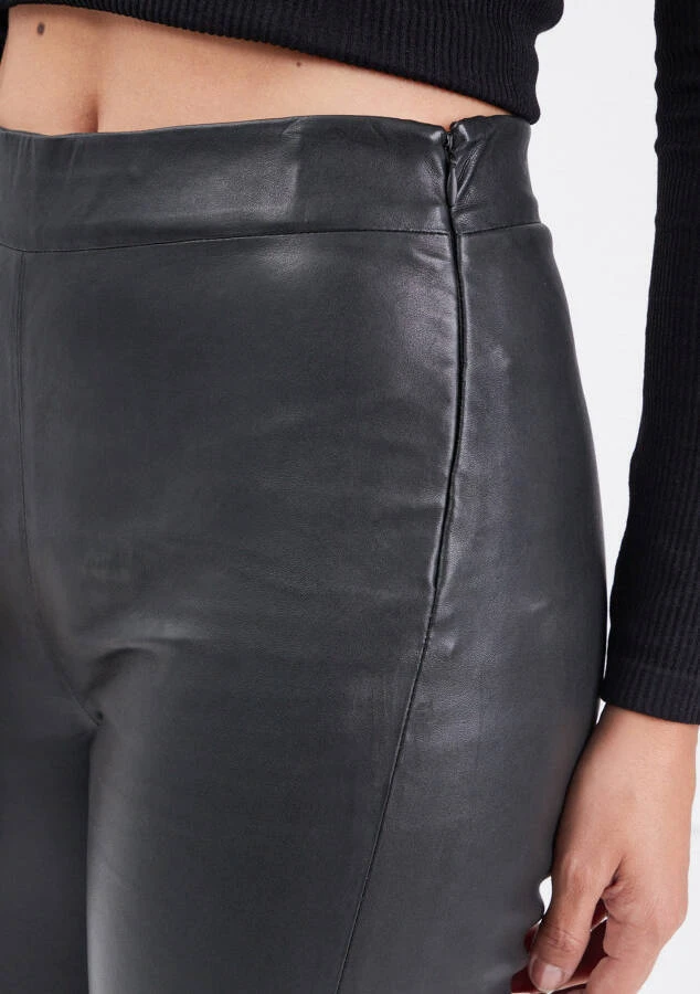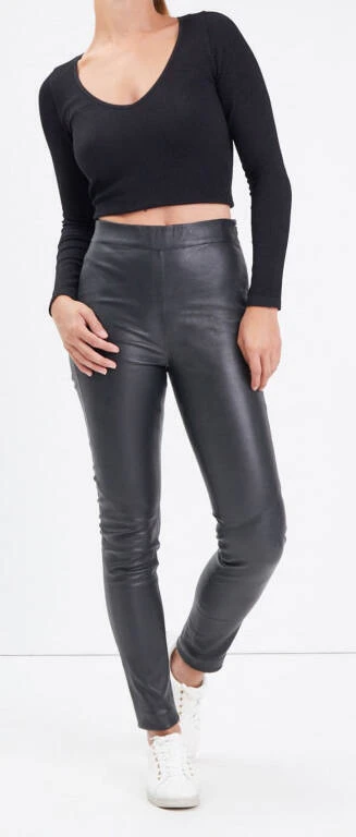 Pantalon en cuir d’agneau noir pour femme de la marque Rose GARDEN . Retrouvez tout le confort d’un legging dans ce pantalon fabriqué dans un cuir d’agneau stretch de haute qualité.Une élasticité rendu possible par un procédé technique breveté. Une coupe skinny qui vous permettra d’affiner votre silhouette. Sa taille est assez haute, avec une fermeture glissière sur le coté presque invisible .Vous n’avez pas de poches sur ce modèle .