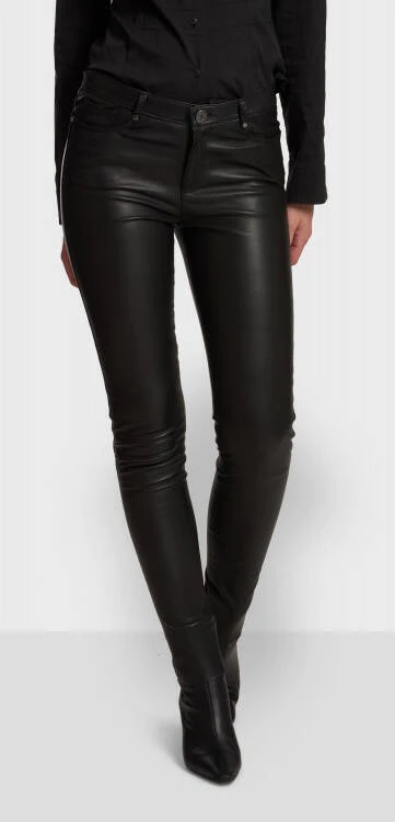 Pantalon cuir femme style legging dans la marque Oakwood . Ce pantalon est en cuir d’agneau, souple, léger . Il s’agit d’un cuir stretch, pour un effet, très slim, esprit legging . Le cuir se prête parfaitement à votre silhouette, très ajusté, assez étroit en jambe . Le bas de la jambe est resserré, vous avez une surpiqure au genou . Le bas n’est ni piqué , ni collé, laissé franc , à faire en fonction de votre longueur de jambe . Le pantalon possède une ceinture avec passants, comptez en en deux sur l’avant et un sur l’arrière . Le cuir se ferme à l’aide d’un bouton , la braguette n’est pas apparente, cachée par une petite patte cuir . Vous avez des petits rivets de la marque au niveau des passants . Il y a des poches devant, très peu profonde, plus déco que pour l’utiliser. Sur les fesses, vous avez également des poches , façon jeans . Ce pantalon cuir est donc très ajusté au corps, style leggin’s, strech, vraiment tendance, accessoire phare de votre garde robe . Comptez une longueur d’entrejambe de 80 cms sur une taille 38 .