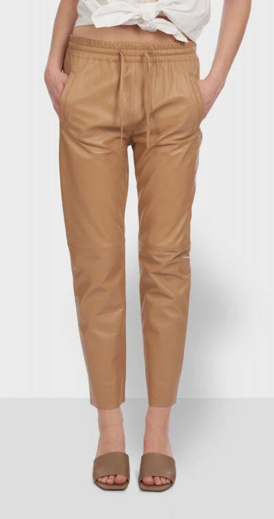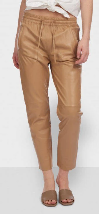 Pantalon en cuir d’agneau pour femme de la marque Oakwood . On retrouve une coupe droite , très confortable, le cuir est vraiment souple, léger . On craque pour ce look à la fois sport, cool et décontracté sur ce pantalon cuir . En effet, sa taille est élastiquée, de plus , vous avez un lien cuir pour resserrer la taille .Il n’y a pas de braguette, juste deux poches plaquées sur l’avant, très pratique . La jambe est droite, il y a une surpiqure au niveau du genou . Sur l’arrière, vous avez deux poches droites sur les fesses .