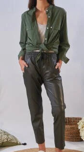 Pantalon en cuir d’agneau pour femme de la marque Oakwood . On retrouve une coupe droite , très confortable, le cuir est vraiment souple, léger . On craque pour ce look à la fois sport, cool et décontracté sur ce pantalon cuir . En effet, sa taille est élastiquée, de plus , vous avez un lien cuir pour resserrer la taille .Il n’y a pas de braguette, juste deux poches plaquées sur l’avant, très pratique . La jambe est droite, il y a une surpiqure au niveau du genou . Sur l’arrière, vous avez deux poches droites sur les fesses .