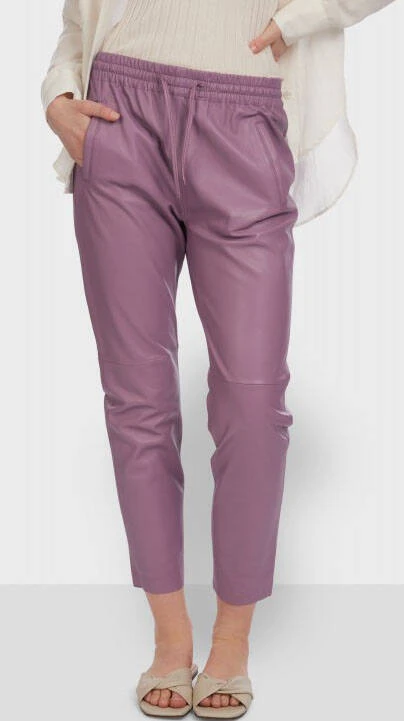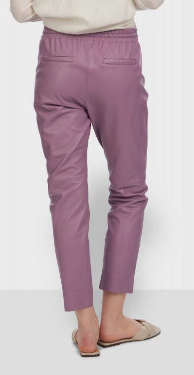 Pantalon en cuir d’agneau pour femme de la marque Oakwood . On retrouve une coupe droite , très confortable, le cuir est vraiment souple, léger . On craque pour ce look à la fois sport, cool et décontracté sur ce pantalon cuir . En effet, sa taille est élastiquée, de plus , vous avez un lien cuir pour resserrer la taille .Il n’y a pas de braguette, juste deux poches plaquées sur l’avant, très pratique . La jambe est droite, il y a une surpiqure au niveau du genou . Sur l’arrière, vous avez deux poches droites sur les fesses .