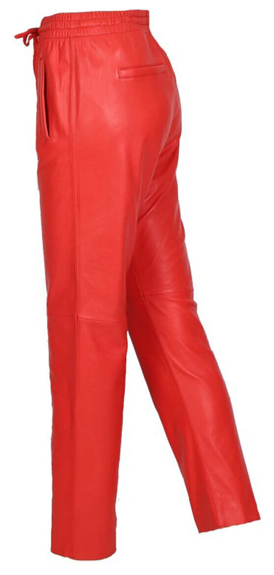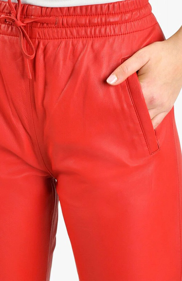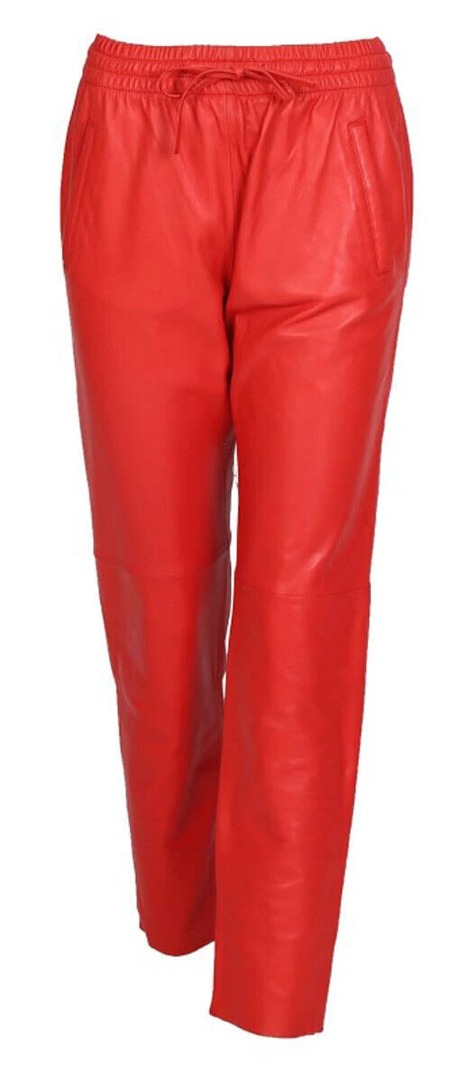 Pantalon en cuir d’agneau pour femme de la marque Oakwood . On retrouve une coupe droite , très confortable, le cuir est vraiment souple, léger . On craque pour ce look à la fois sport, cool et décontracté sur ce pantalon cuir . En effet, sa taille est élastiquée, de plus , vous avez un lien cuir pour resserrer la taille .Il n’y a pas de braguette, juste deux poches plaquées sur l’avant, très pratique . La jambe est droite, il y a une surpiqure au niveau du genou . Sur l’arrière, vous avez deux poches droites sur les fesses .