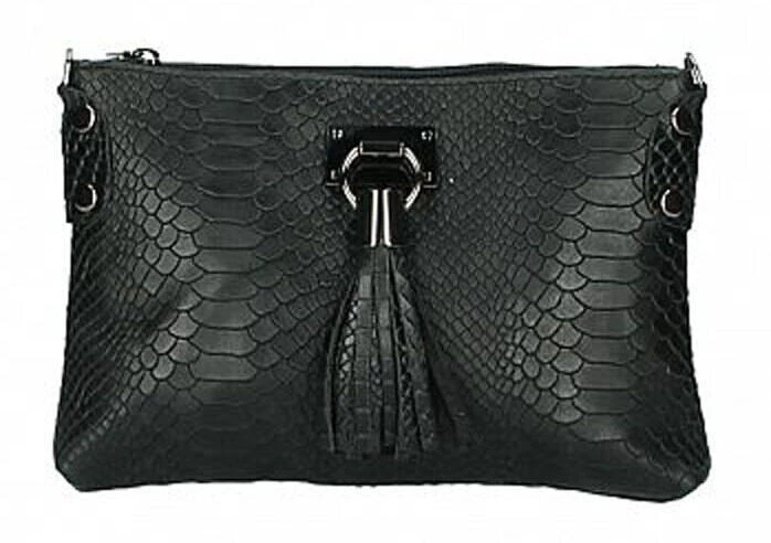 Petite pochette en aspect velours sur imprimé python. Vous pouvez la porter aussi bien à la main qu’à l’épaule grâce à sa bandoulière amovible. La pochette cuir est doublé en polyester , vous avez un compartiment principal et une poche plate zippée.On aime son look qui sort de l’ordinaire, et sa fantaisie sur l’avant, avec la plaque métal et son cuir à franges. Ses dimensions sont de 25 cm de long , 3 cm de profondeur et 17 cm de hauteur pour environ 0.25 kg.