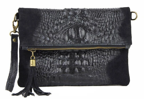 Petite pochette main en cuir de vachette pour femme. Pour plus d’originalité , le cuir est travaillé aspect cuir croco. Vous avez en ajout une bandoulière , vous pouvez ainsi la porter plus décontracté à l’épaule. Vous avez une fermeture zippée, une grande poche centrale.