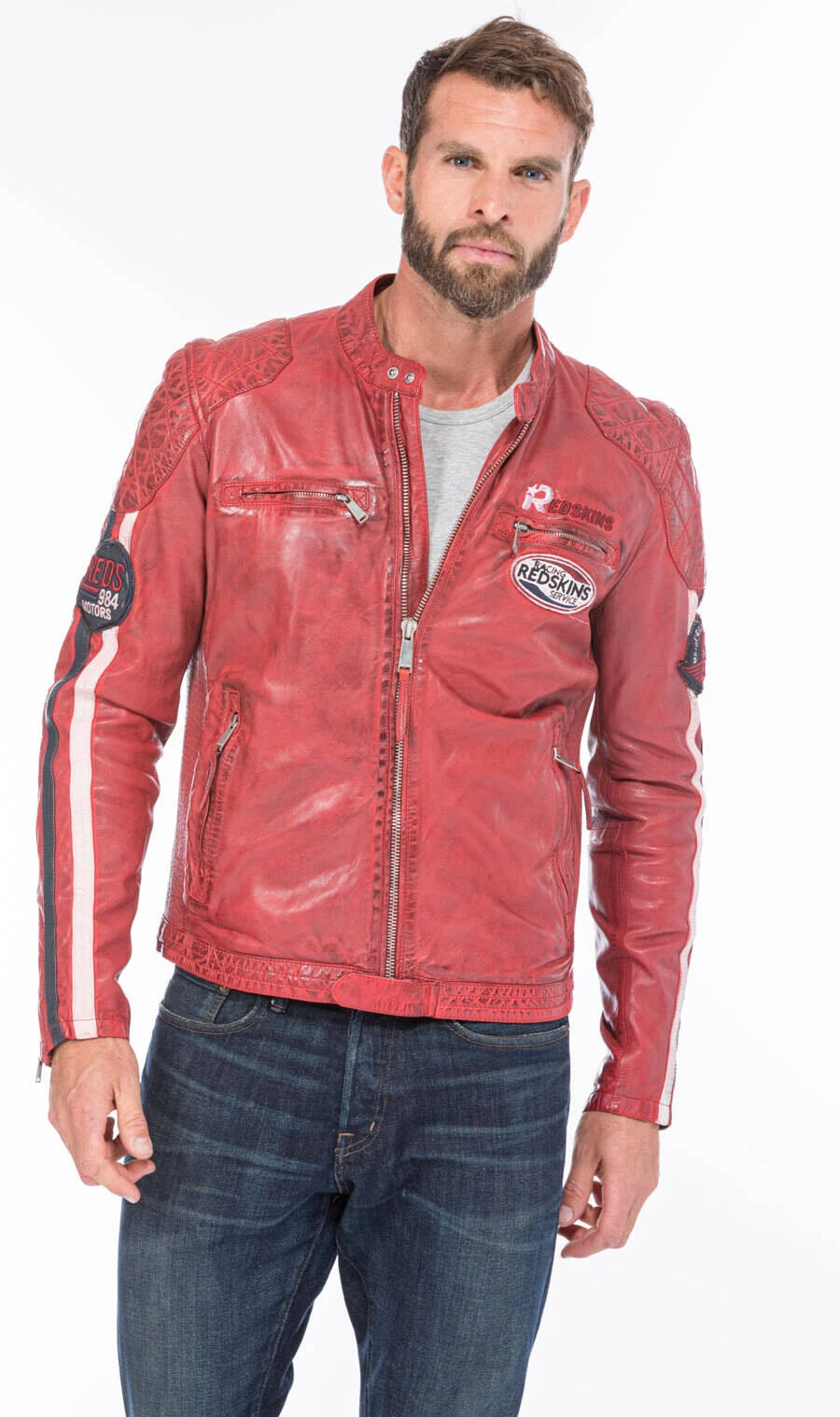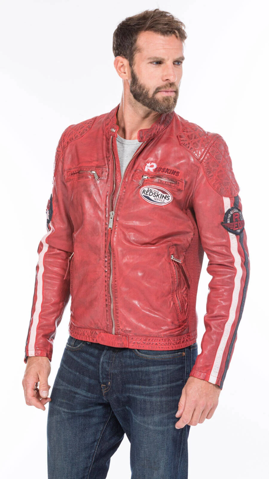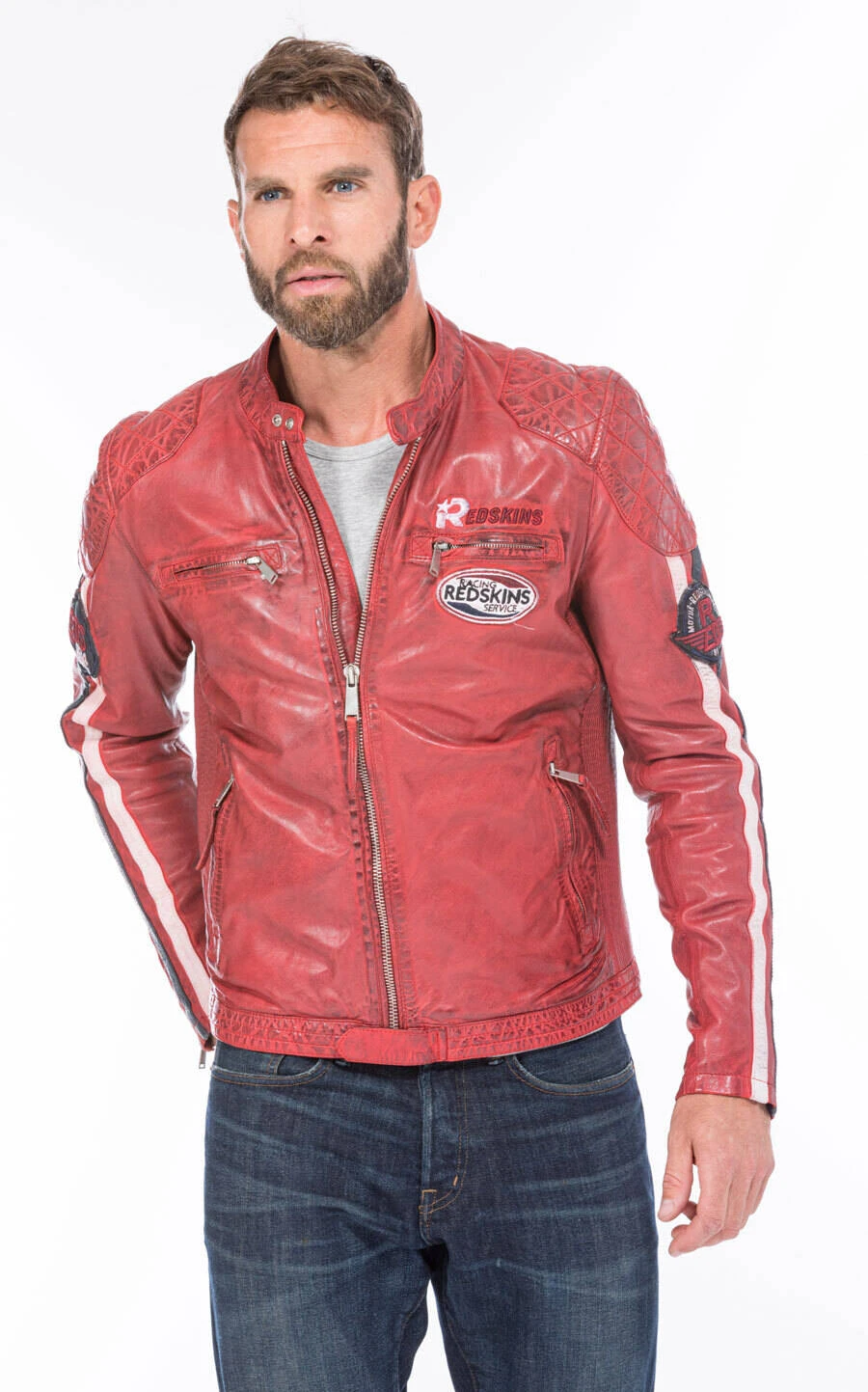 Blouson en cuir d’agneau pour homme de la marque dans un coloris rouge . On craque littéralement sur son look motard, hyper sympa pour la ville . Le blouson est idéal sur un tee shirt, jean et boots, plutôt demi saison, il ne possède pas de renfort, de coque sur un blouson moto. Il est en cuir d’agneau , souple, assez léger, sa doublure est en coton au niveau du corps et en polyester au niveau des manches, avec 2 poches intérieures .Le blouson cuir possède un petit col mao à pression, se ferme à l’aide d’un zip droit. Vous avez 4 poches zippées sur le devant, deux en poitrine et deux plus basses.Il est agrémenté d’ écussons aspect vieilli sur la poitrine et le haut des manches . Il y a également un matelassage aux épaules, coudes et bas de la taille. Il y a 2 bandes cuirs blanc et bleu marine sur chaque manche.Le blouson cuir possède des petits zips d’aisance en bas de manche, plus fun, pratique. La coupe est assez ajustée au corps, plus dynamisant, de plus le cuir est entièrement élastiqué sur les cotés pour épouser au mieux votre corps , très confortable .