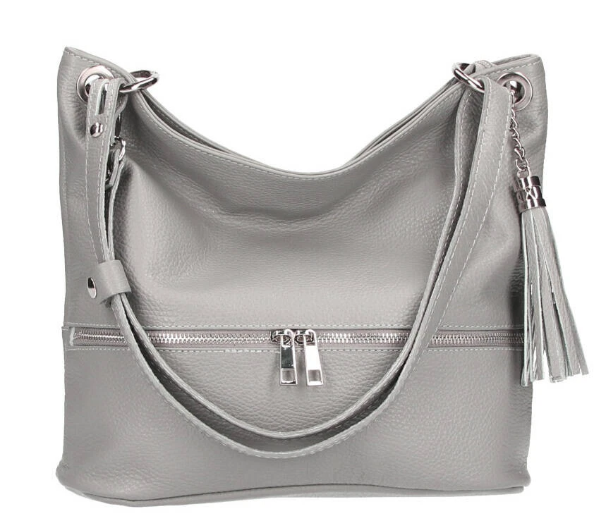Sac à main en cuir de vachette aspect grainé , chic et sport. Ce sac en cuir se ferme à l’aide d’un zip, à l’intérieur, vous avez une poche de séparation zippée, deux grands compartiments, une petite poche zippée et deux petites poches ( portable, clefs , etc ) . La doublure est en polyester, les accessoires couleur nickel. Sur le dessus , on aime la fantaisie apporté avec ses zips, la petite chaine avec le bout de cuir à franges.