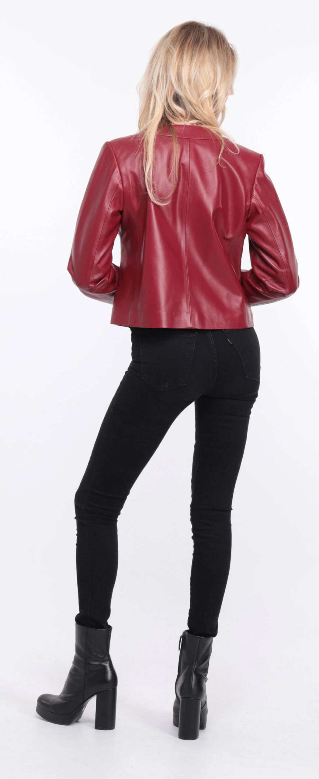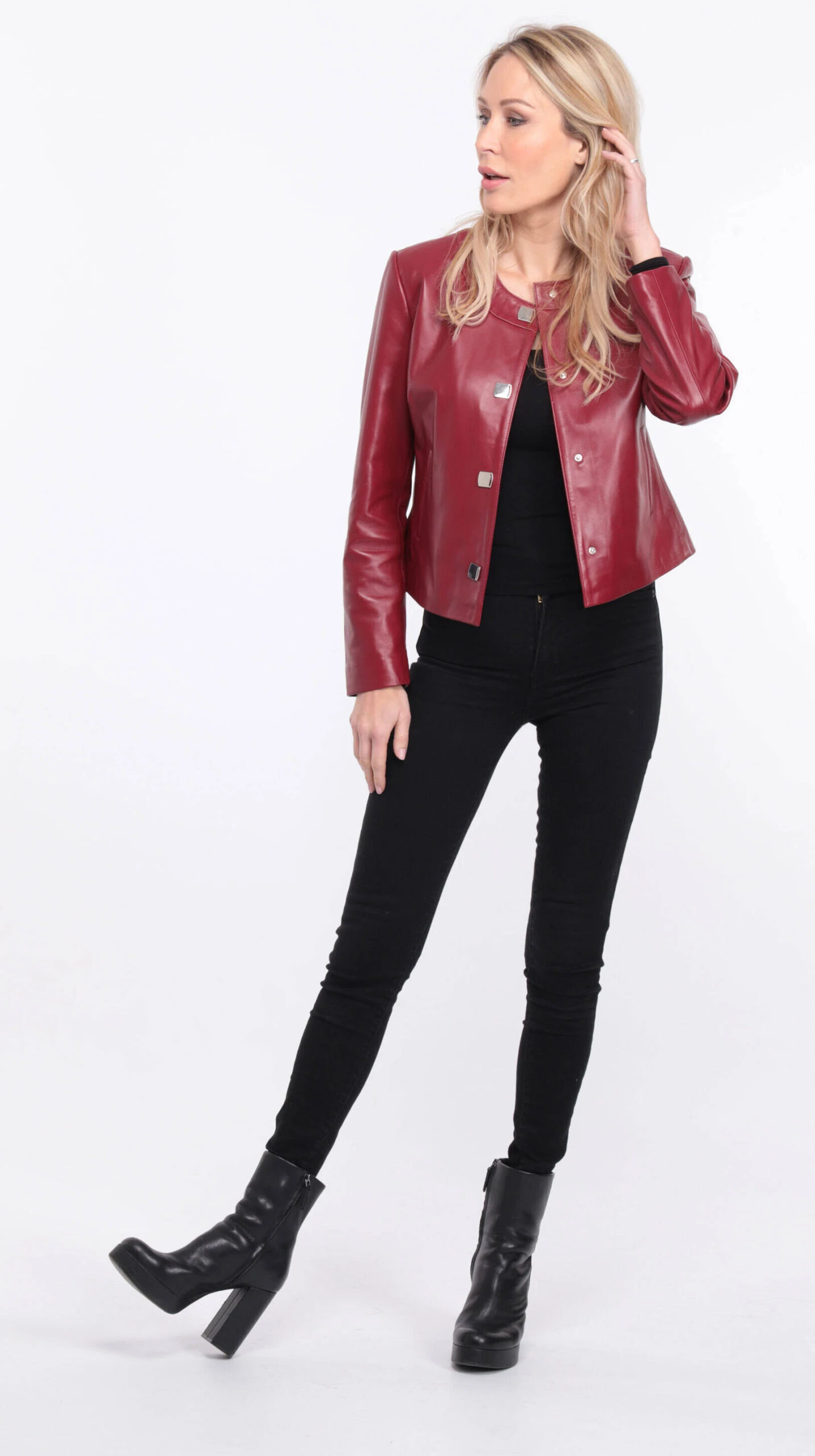 Petit spencer en cuir d’agneau pour femme , sobre, élégant. Il est très souple, confortable, idéal pour la mi saison ou à porter en veste d’intérieur sous un manteau en hiver. Vous avez une découpe de col rond, des boutons pressions , deux poches biais. .