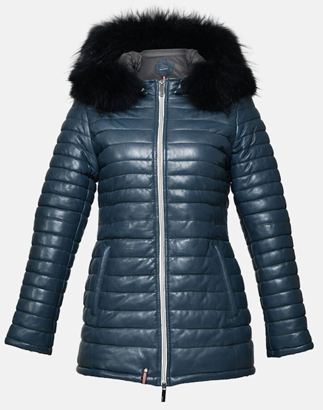 trois quart cuir, capuche avec bordure renard, col montant, fermeture par zip, poches biais, entièrement surpiqué façon doudoune, souple, longueur corps 75 cms