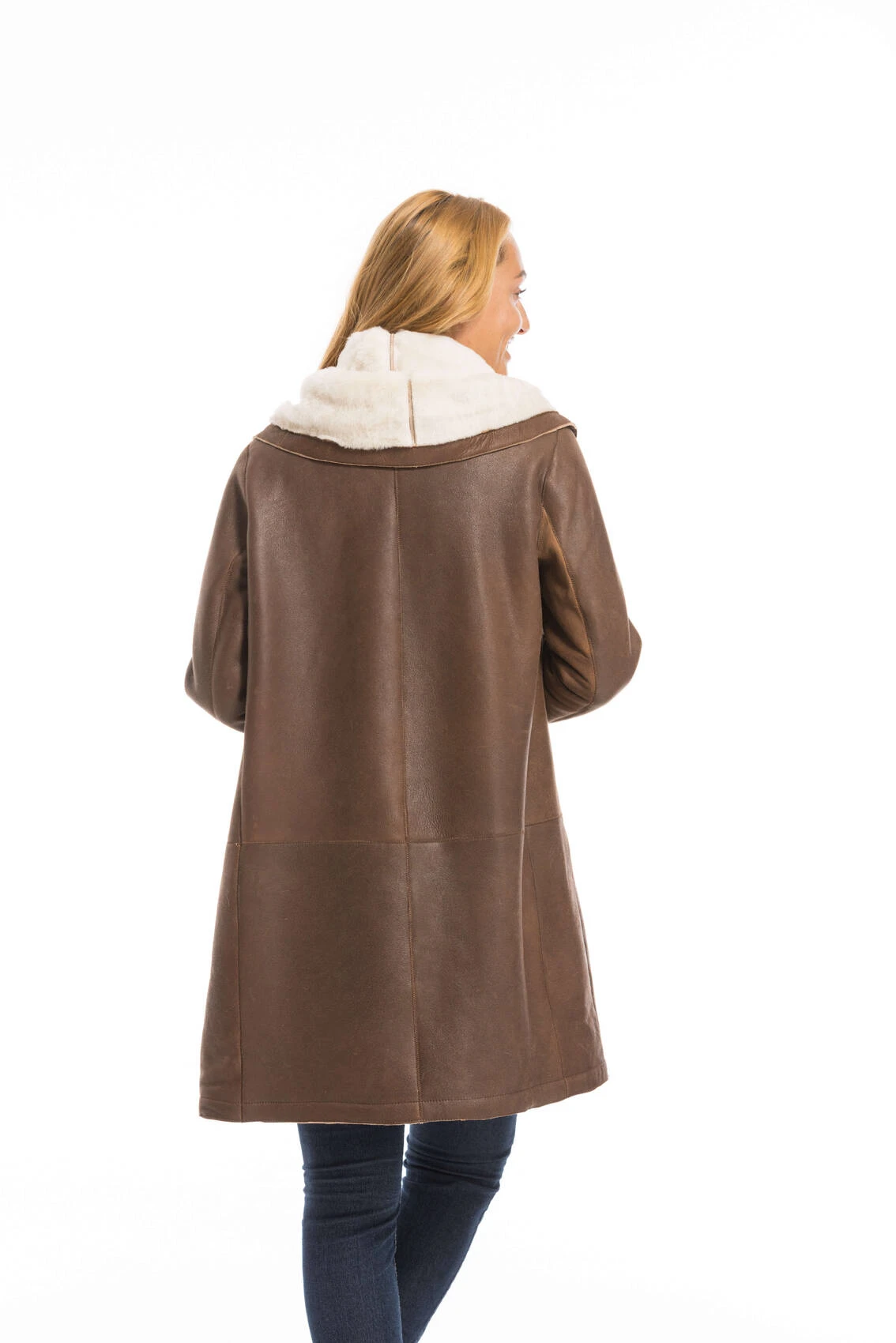 Trois quart cuir femme en mouton à capuche, coupe droite, mouton de couleur naturel à l’intérieur, fermeture par crochet, 2 poches biais