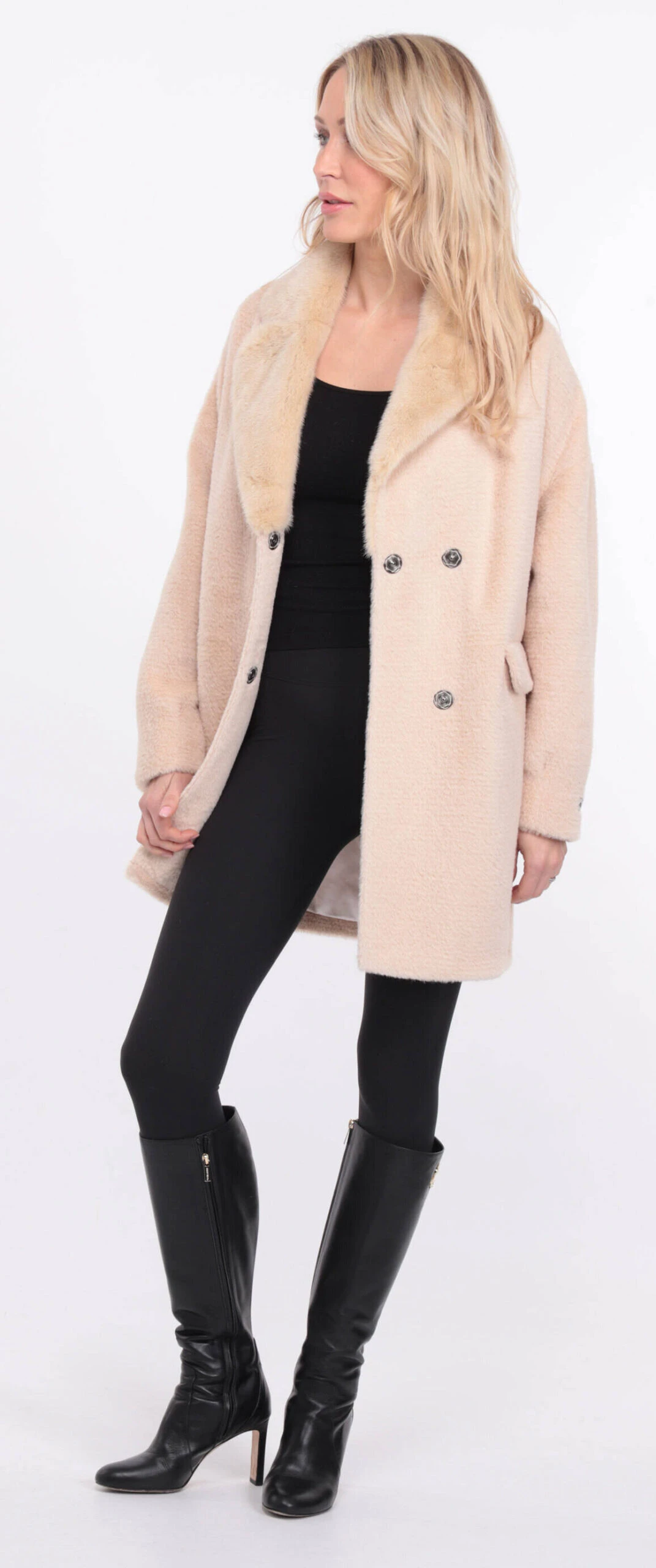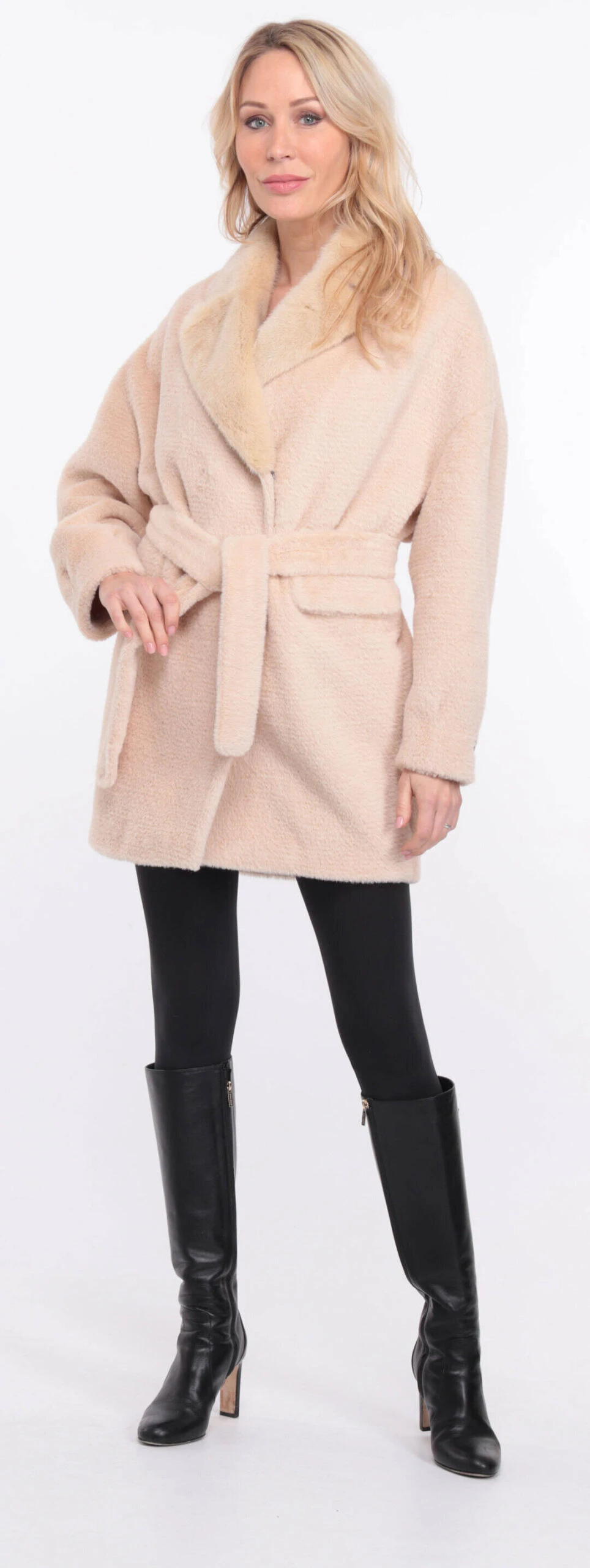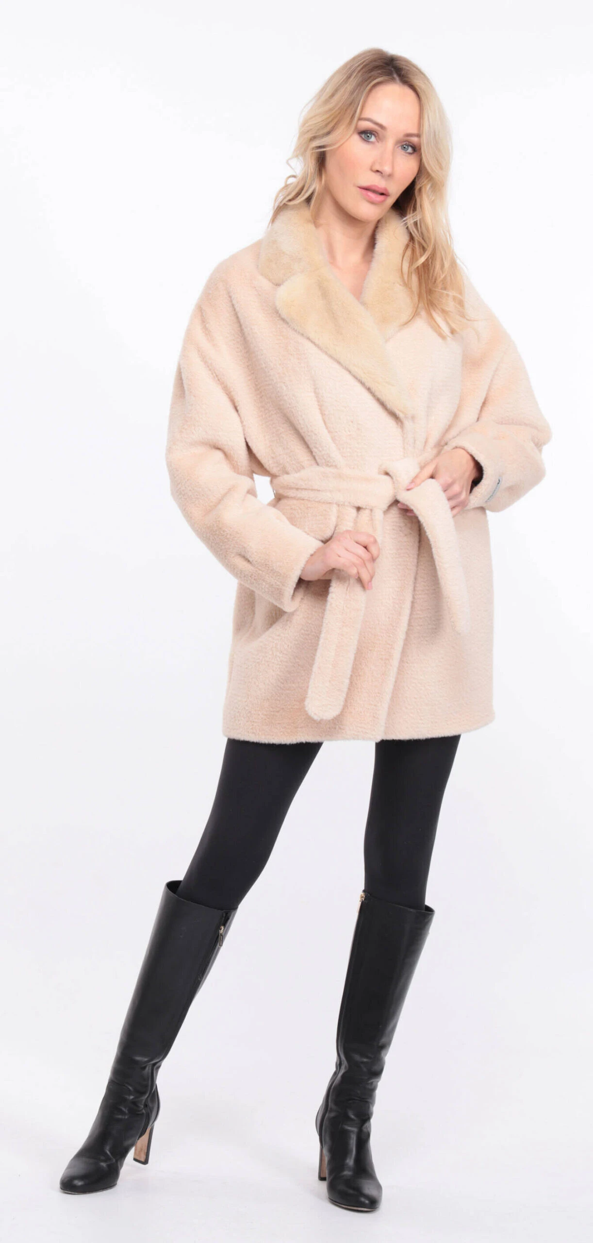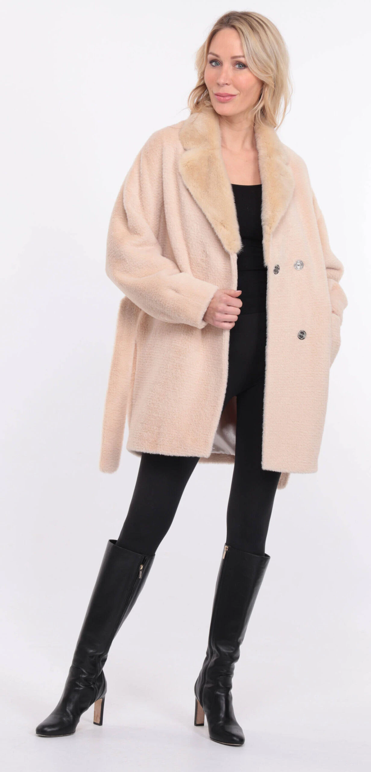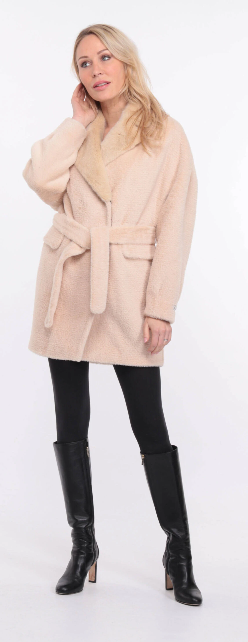Veste droite pour femme en alcantara écru agrémenté d’un joli col en vison. De forme droite , confort , chaude et légère pour l’hiver, elle possède une ceinture pour plus de féminité . Le veste se ferme à l’aide de boutons pressions, elle possède deux poches à rabat sur l’avant .