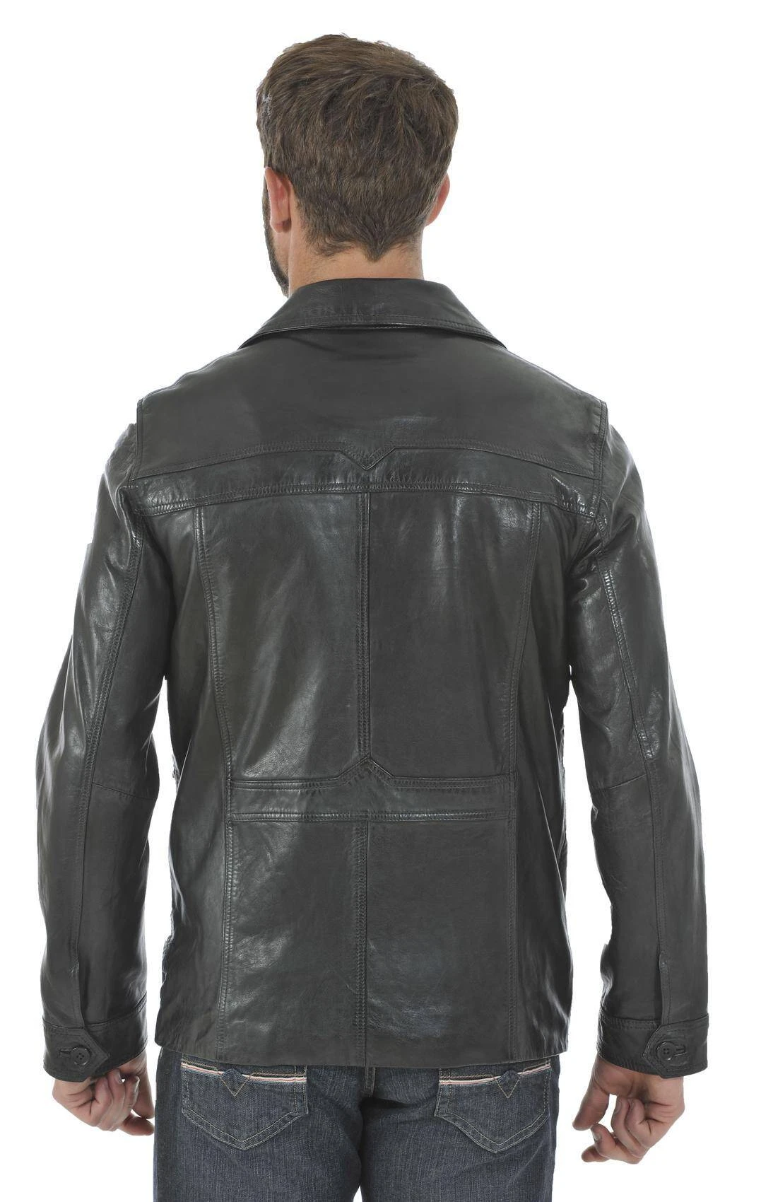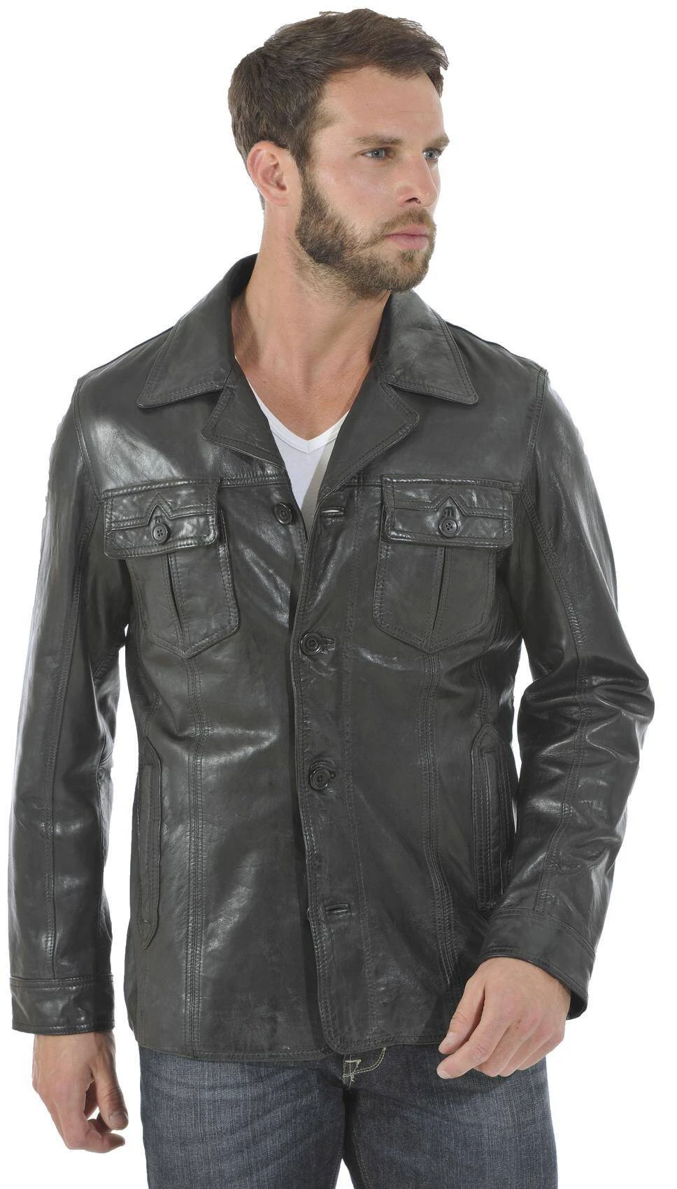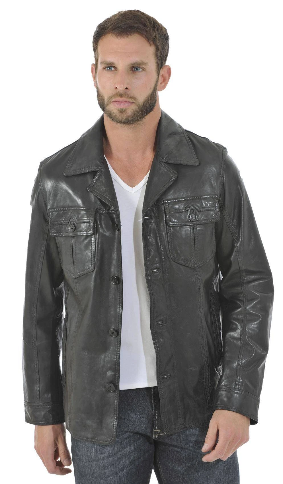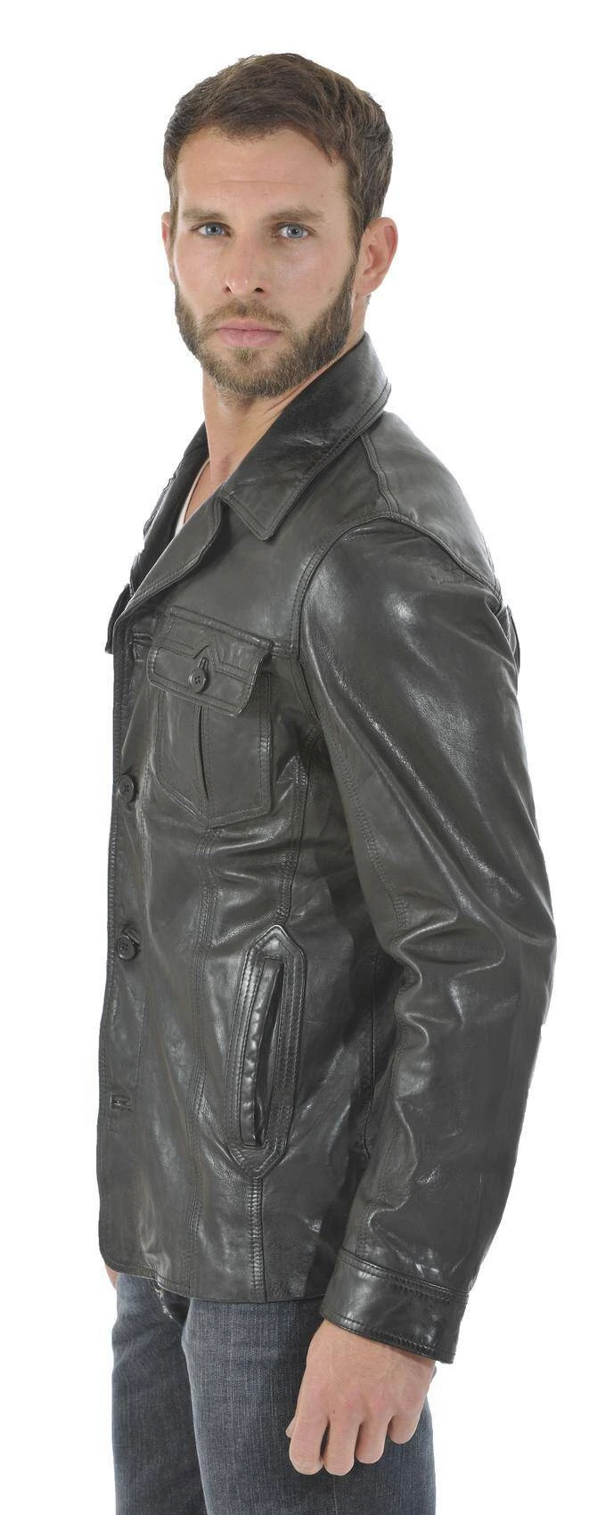 Splendide veste en cuir d’agneau couleur noir pour homme. Cette veste est en cuir d’agneau lavé ce qui donne un coté plus branché, sport. Le cuir est un peu plus rigide, tout en restant très agréable, l’aspect est vieilli , nuancé, plus tendance. On aime son coloris noir, basique, facile à associer, toujours d’actualité. La veste est assez courte ce qui est plus tendance , elle est parfaite pour toutes les saisons. Sa doublure est en polyester , fine, avec deux poches intérieures pour apporter avec vous vos effets personnels. Vous porterez aussi bien cette veste sur un simple tee shirt, qu’une chemise ou un bon pull à col roulé en hiver, très polyvalente. Son style destructuré et sa ligne cintrée vous assurent un look très décontracté, sportwear . Vous avez deux poches poitrines à rabat bouton et deux simples poches en biais, pour les mains. Cette veste cuir noir vous assure une allure irréprochable. Vous retrouvez des surpiqûres sur le haut du dos, qui donne une petite fantaisie au vêtement. Vous porterez son col tailleur légèrement relevé pour un look plus cool. Sur les bas de manches, on retrouve deux poignets en cuir qui assure un meilleur maintien et plus joli esthétiquement. Cette veste cuir noir va devenir la pièce maitresse de votre dressing . Nous vous proposons cette jolie veste également en coloris cognac pour un coté plus fun .