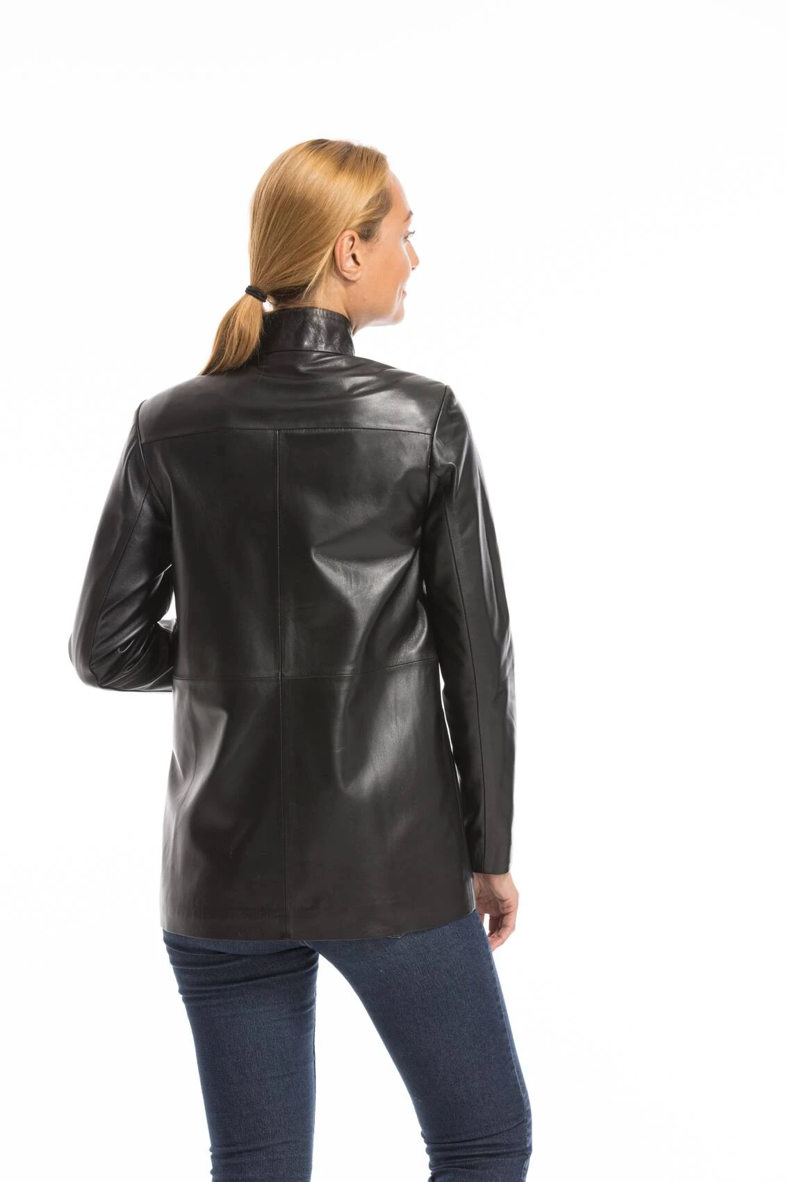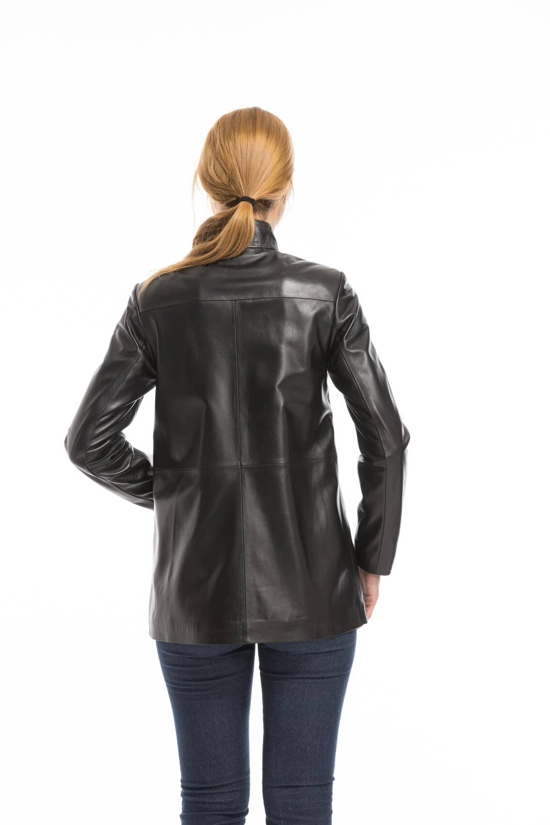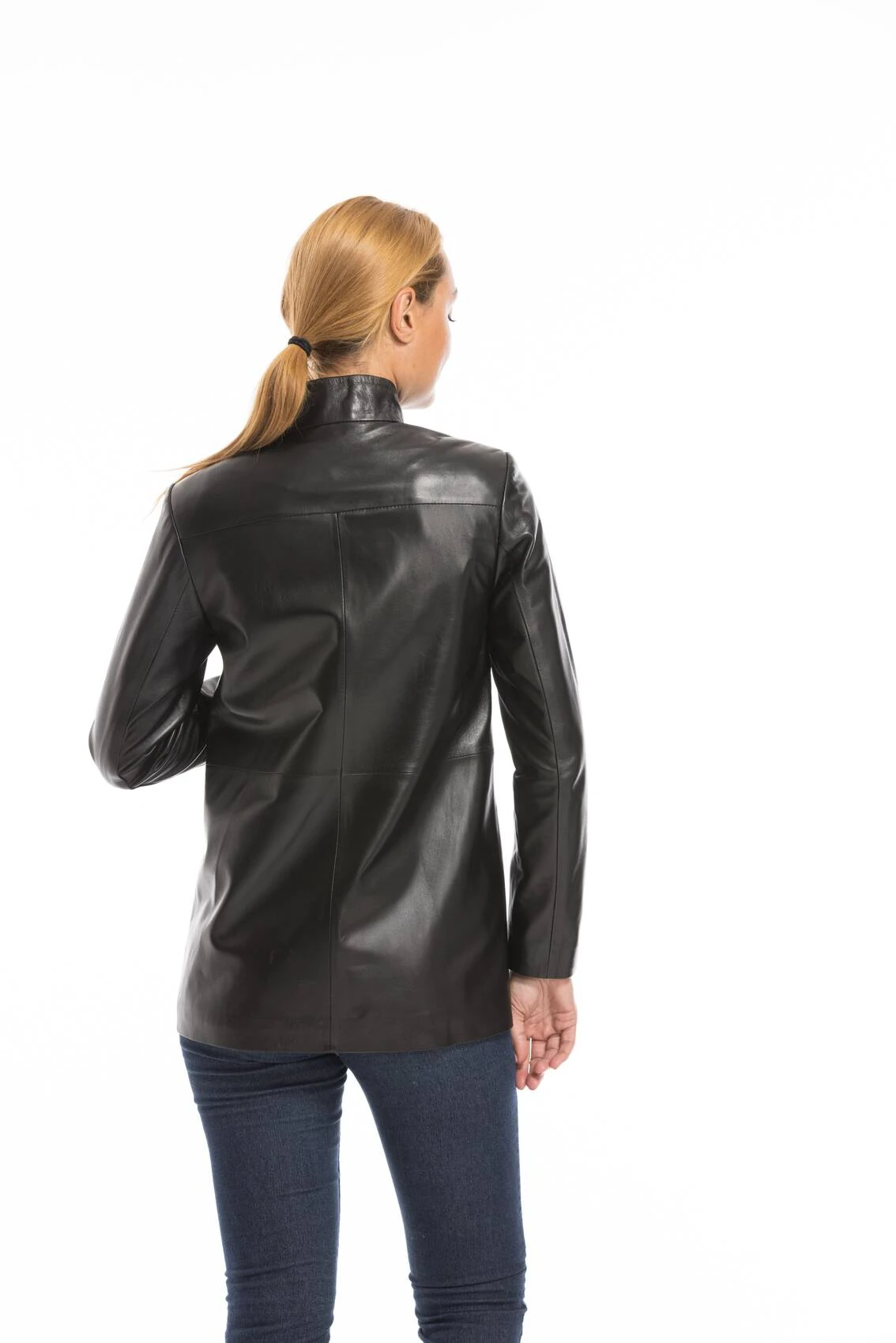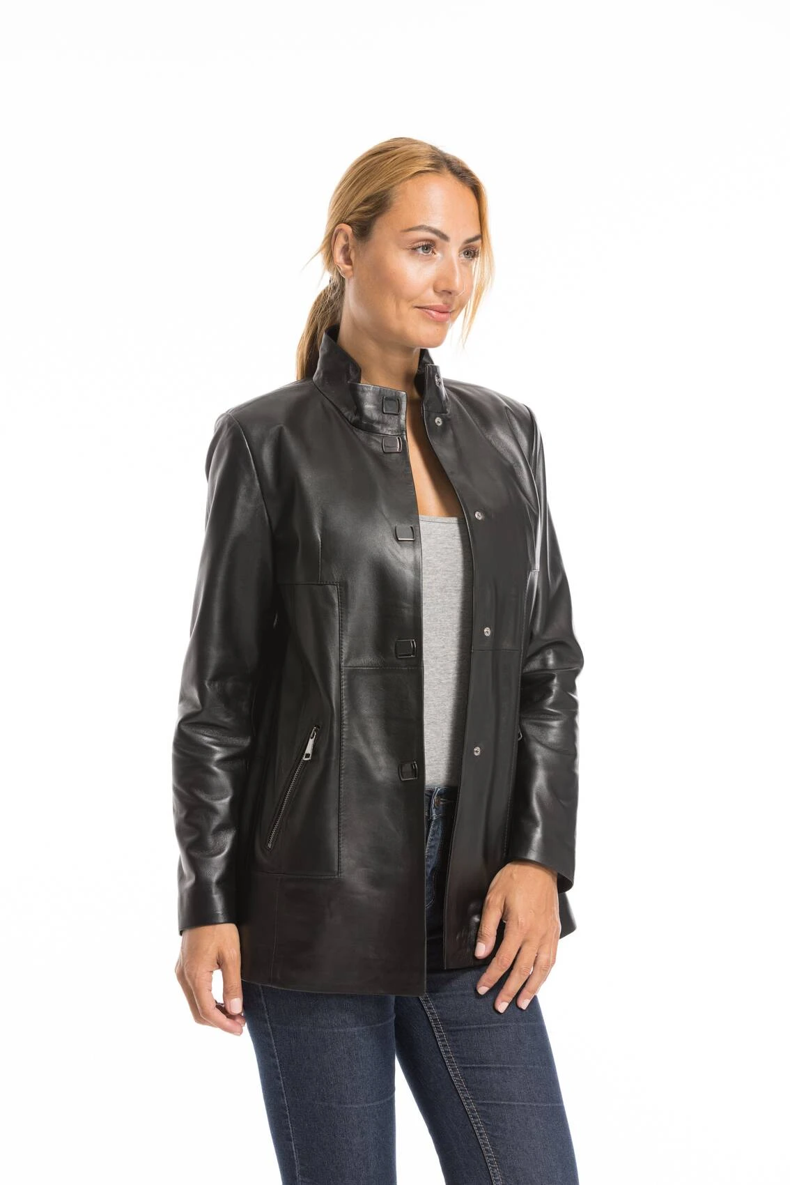 Veste en cuir d’agneau pour femme, chic et sobre . Elle possède un col debout rabattable en col chemise. Le 3/4 cuir se ferme par des pressions fantaisies. Vous retrouvez au niveau de la taille 2 poches biais zippées. Le cuir d’agneau est souple, agréable à porter, la doublure est fine, confortable .