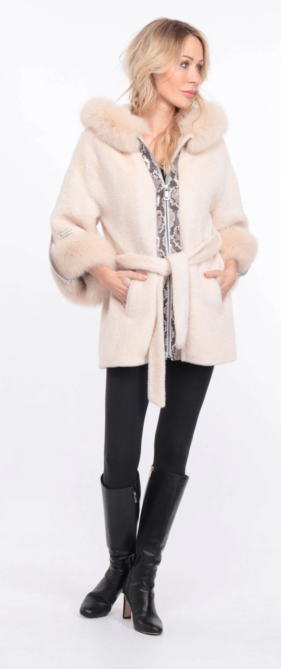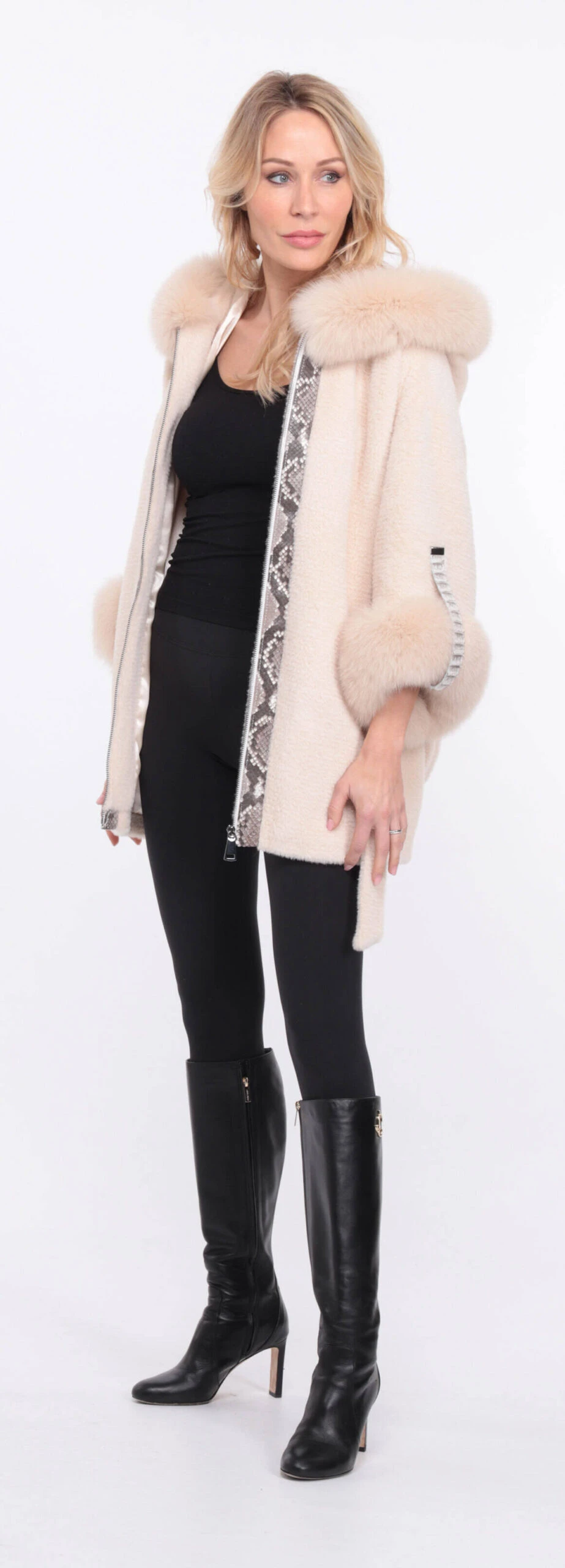 Veste femme demi longueur en alcantara beige , très chic et chaude . Vous avez une capuche bordée de fourrure véritable de renard , vous en avez également en bas de manche. La veste se ferme à l’aide d’un zip droit , il y a également une ceinture pour marquer la taille . Vous avez une jolie finition imitation python sur la bordure de zip et sur la patte de manche.