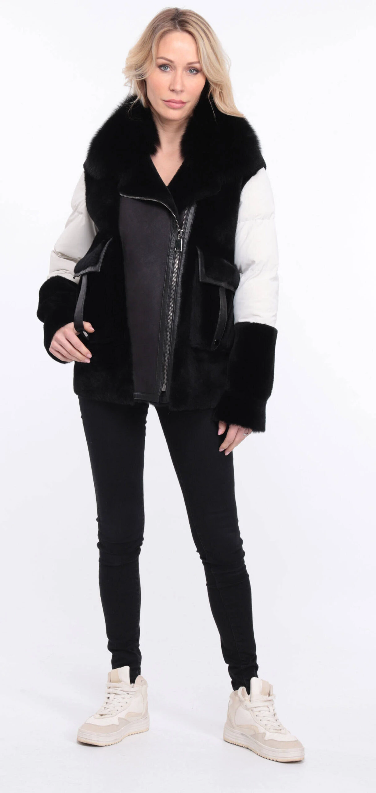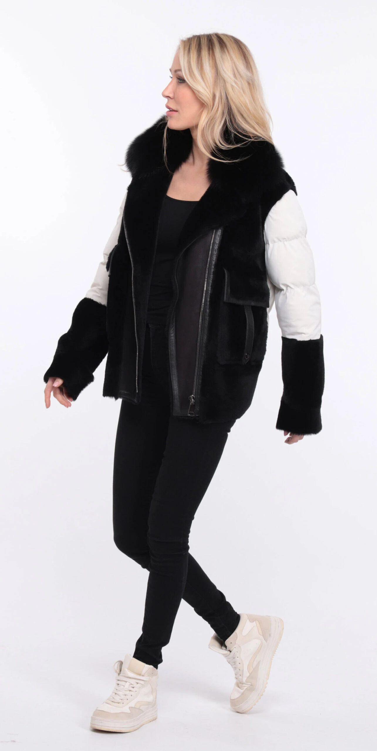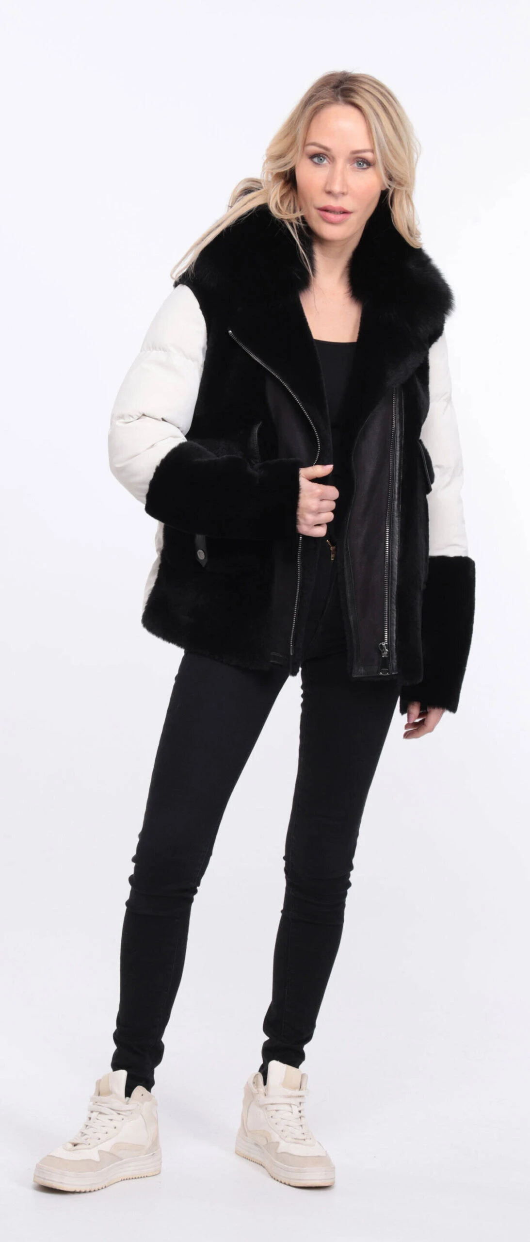 Veste en cuir de mouton + tissu agrémenté d’un col en fourrure véritable de renard. Comment ne pas craquer sur cette veste au look assez particulier. On aime sa souplesse tout en restant un vêtement chaud pour l’hiver. La coupe est droite, vous avez un col tailleur , une fermeture asymétrique . Sur l’avant , vous avez des grandes poches plaquées à rabat avec un pression. Vous avez un grand col en renard pour plus d’élégance , le corps sur l’avant est en mouton , ainsi que le bas de manche et le haut des manches, le dos est en tissu , esprit doudoune.