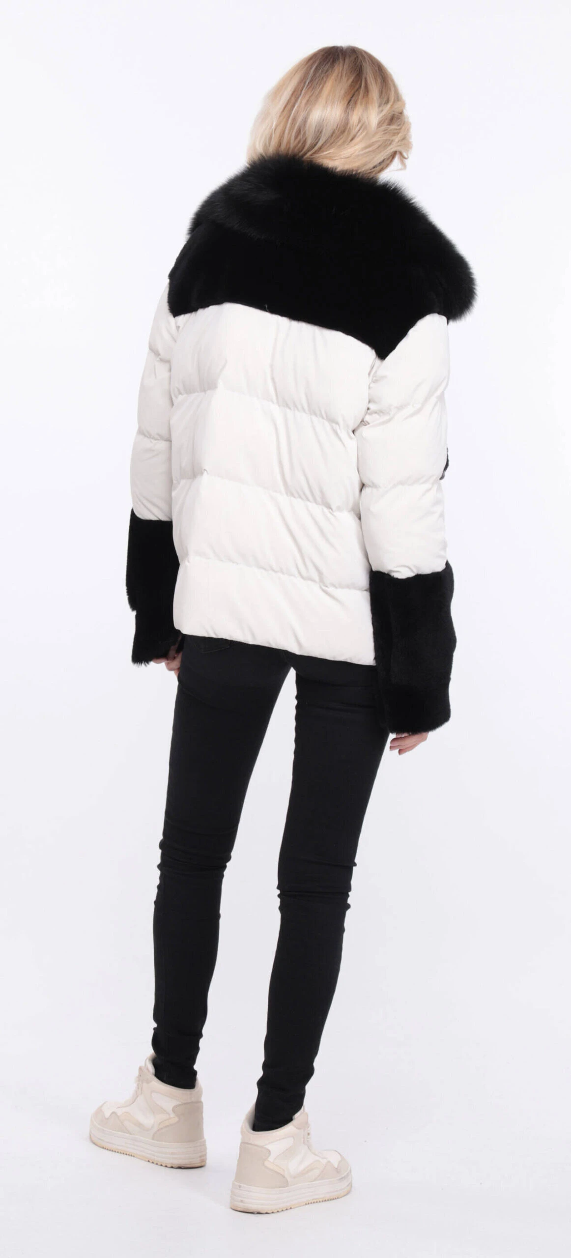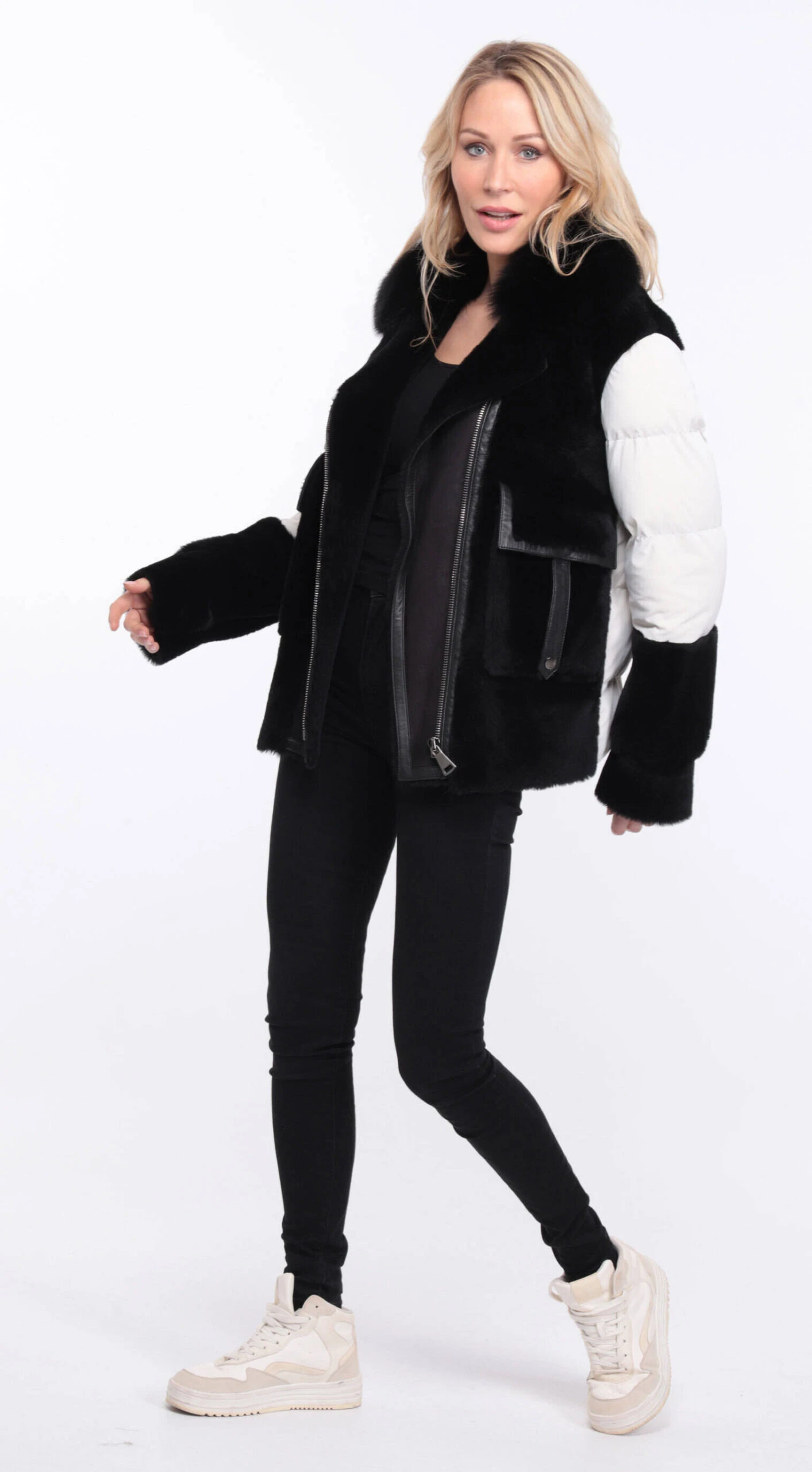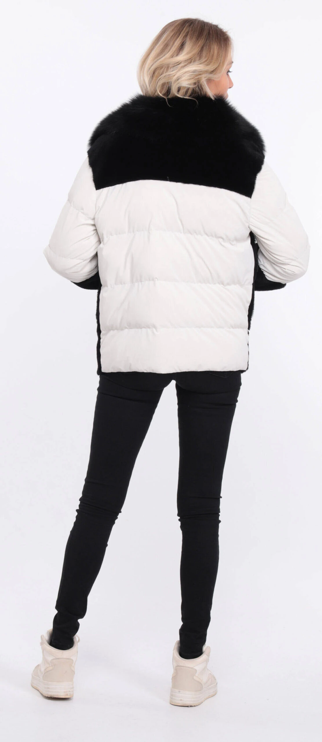 Veste en cuir de mouton + tissu agrémenté d’un col en fourrure véritable de renard. Comment ne pas craquer sur cette veste au look assez particulier. On aime sa souplesse tout en restant un vêtement chaud pour l’hiver. La coupe est droite, vous avez un col tailleur , une fermeture asymétrique . Sur l’avant , vous avez des grandes poches plaquées à rabat avec un pression. Vous avez un grand col en renard pour plus d’élégance , le corps sur l’avant est en mouton , ainsi que le bas de manche et le haut des manches, le dos est en tissu , esprit doudoune.
